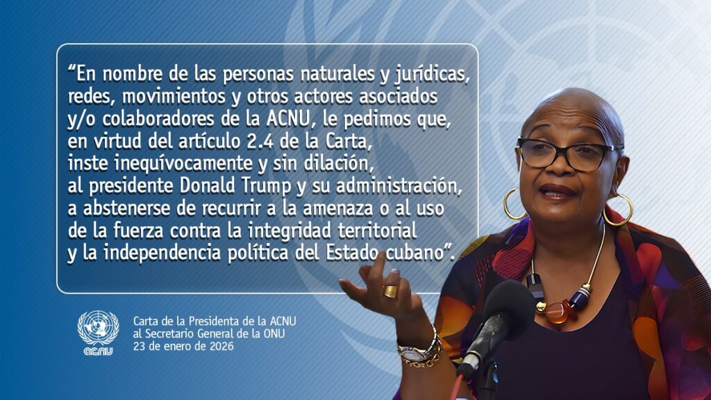 En nombre de las personas naturales y jurídicas, redes, movimientos y otros actores asociados y/o colaboradores de la ACNU, le pedimos que, en virtud del artículo 2.4 de la Carta, inste inequívocamente y sin dilación, al presidente Donald Trump y su administración, a abstenerse» de recurrir a la amenaza o al uso de la fuerza contra la integridad territorial y la independencia política» del Estado cubano.