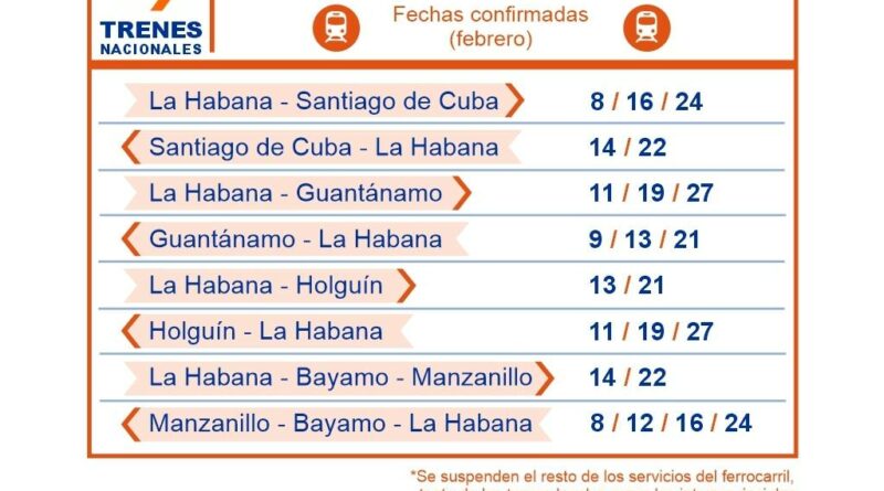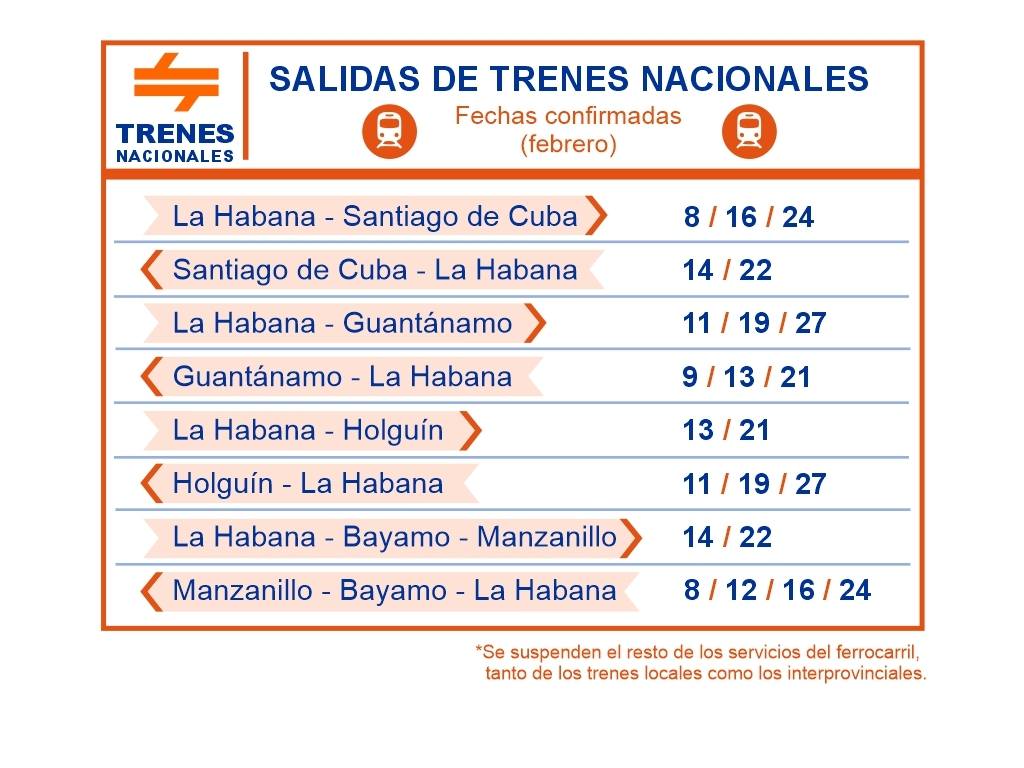 4- Se extiende de cuatro, a ocho días, la frecuencia de salida de los trenes nacionales del ferrocarril, se extenderá de cuatro a ocho días la frecuencia de salida a los destinos previstos: Bayamo/Manzanillo, Holguín, Santiago de Cuba y Guantánamo. Se suspende el resto de los servicios locales e interprovinciales del Ferrocarril. En la infografía se muestran los servicios que se mantienen.