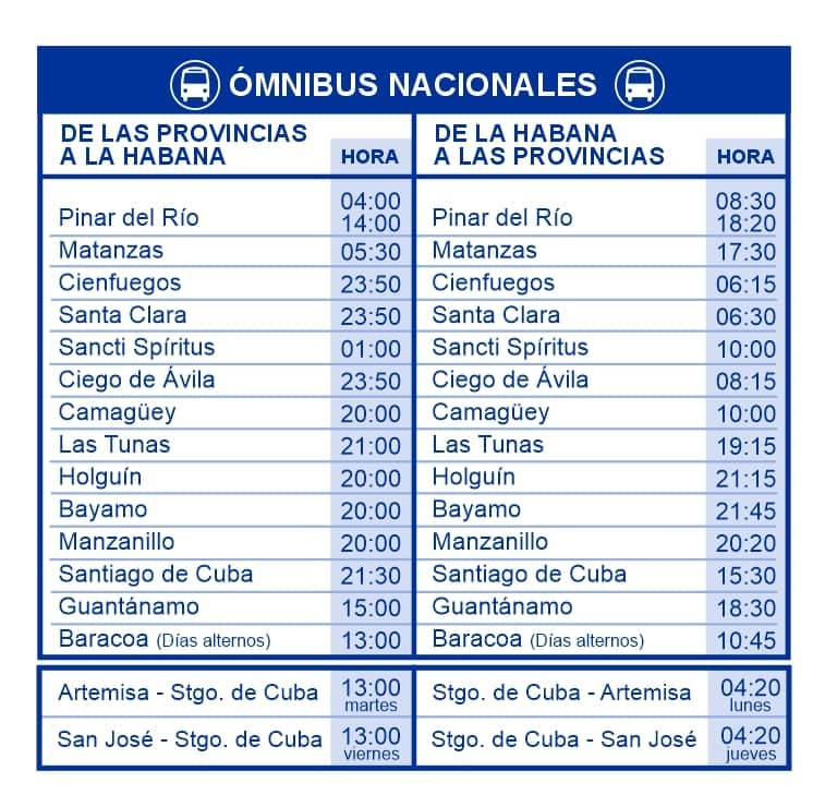 3- Se ajusta la programación de la Empresa de Ómnibus Nacionales a solo una salida diaria entre La Habana y las cabeceras provinciales y Manzanillo. En el caso de Pinar del Río se mantienen dos salidas diarias y a Baracoa que operará días alternos en ambos casos desde La Habana. El resto de las salidas se suspenden. En la infografía los detalles de las salidas que se mantienen.