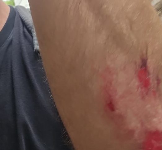 foto: el brazo de nuestro fotógrafo de Resumen Latinoamericano muestra las marcas de lo que fue una brutal represión contra manifestantes y prensa.
