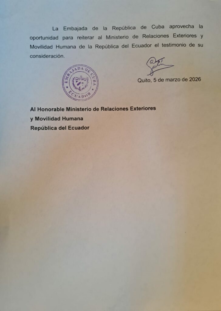 En consecuencia, a partir de las 10:00 a.m. (hora de Quito) de hoy 6 de marzo de 2026, el inmueble que hasta la fecha ha albergado la Embajada de Cuba en Ecuador cesa sus funciones como sede diplomática.