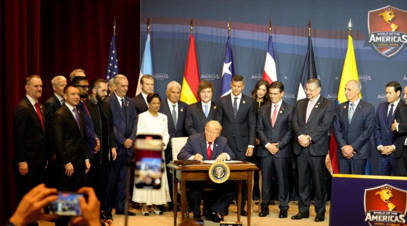 ¿Qué es el Escudo de las Américas? Trump lo definió como una nueva coalición militar para erradicar cárteles, criminales, pandillas e “influencias extranjeras hostiles” (léase China). Si bien se refirió constantemente a “todo el hemisferio”, o sea, a todos los países americanos, la realidad es que sólo estaban presentes alrededor de un tercio: 12 de 34 países.