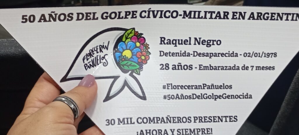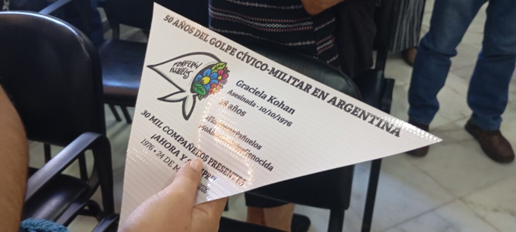 «Los organismos de derechos humanos que nosotros reafirmamos, junto con las madres, junto con las abuelas, 50 años después reafirmamos que sí fue genocidio, sí son 30.000 los desaparecidos. Fue genocidio por cuanto se le aplica a un pueblo, a una población durante un tiempo constante un daño terrible que compromete la vida de esos seres humanos.