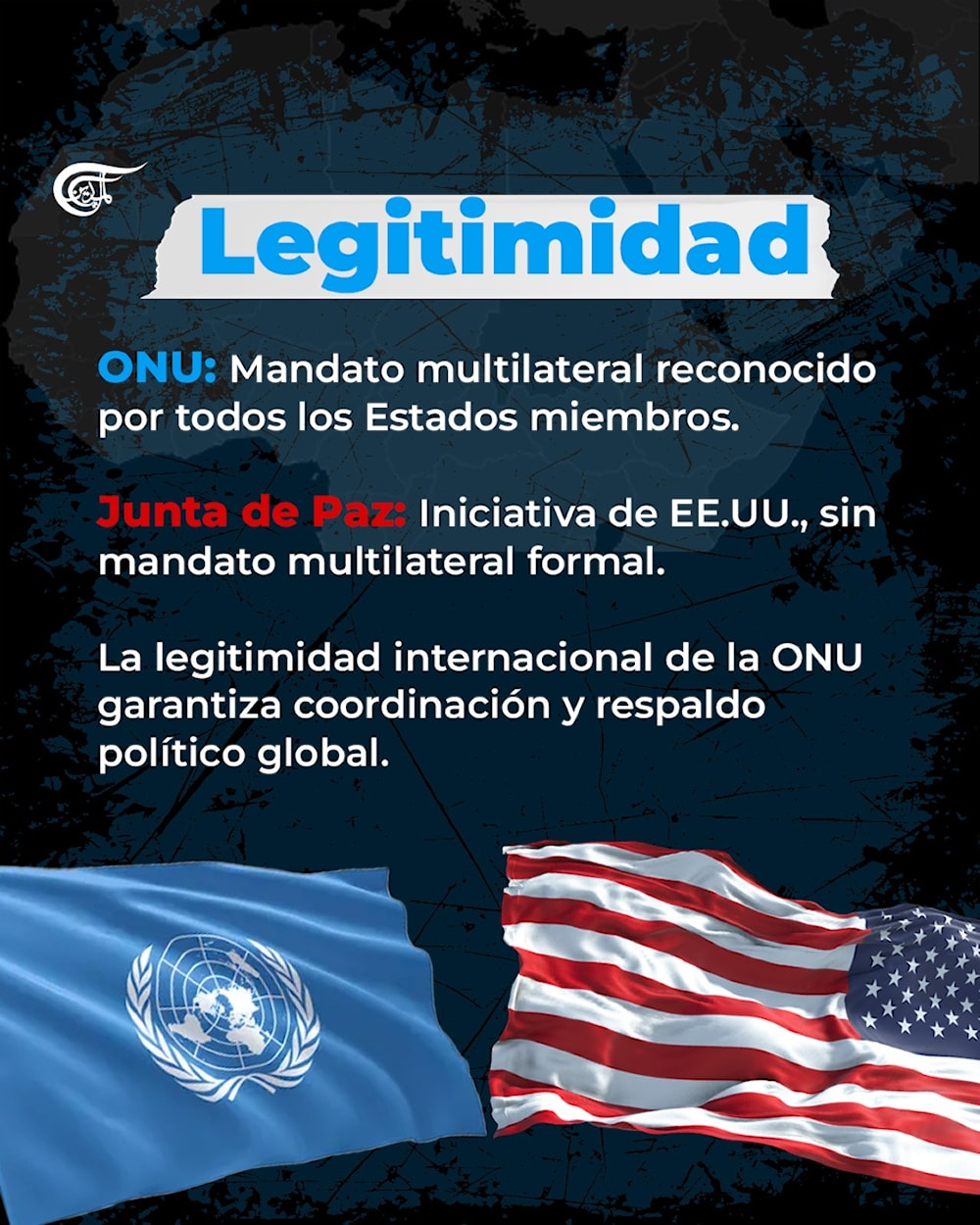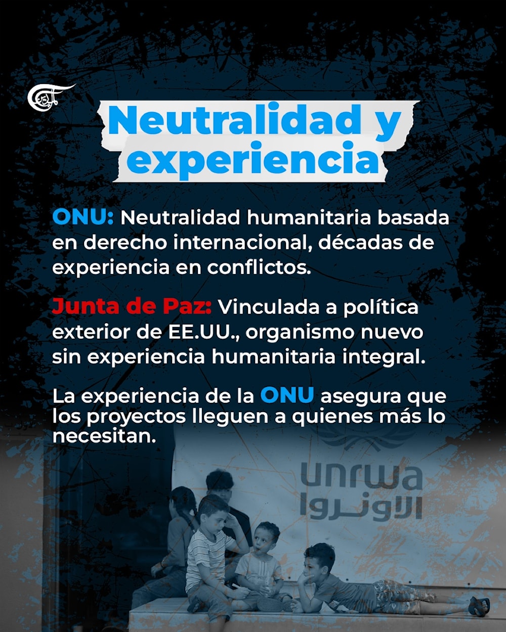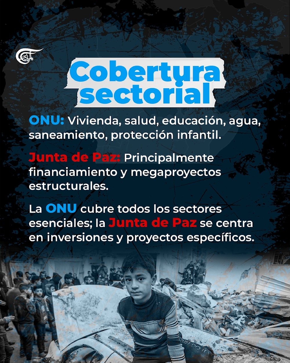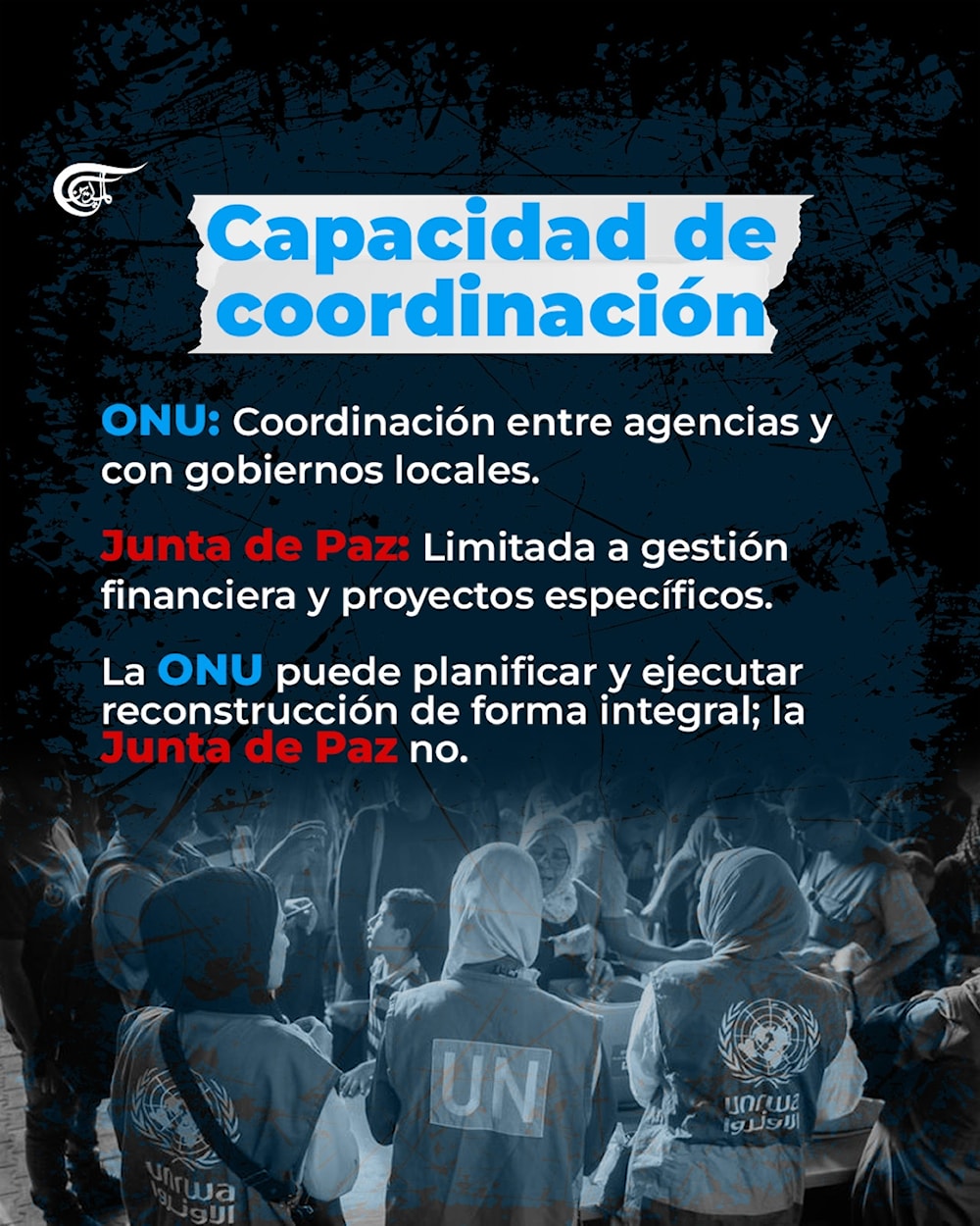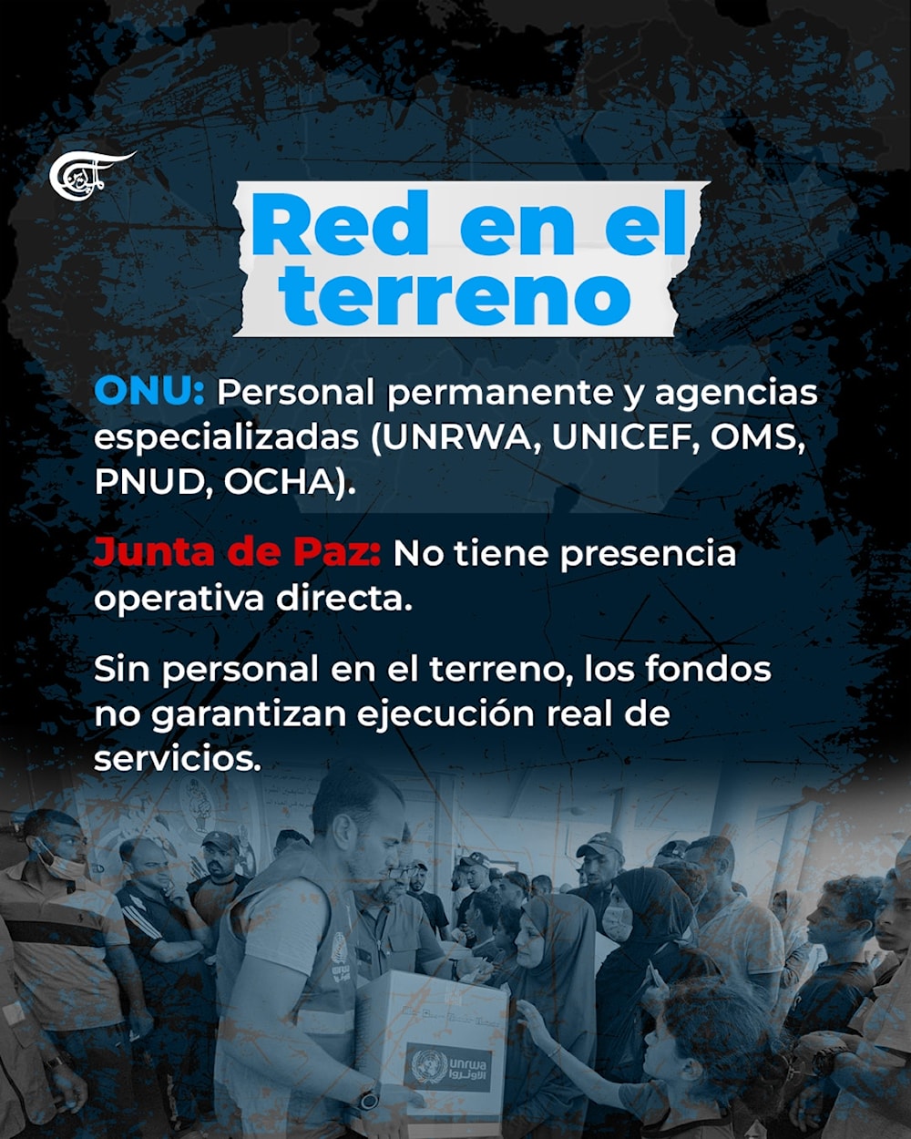 Mientras la llamada Junta de Paz impulsada por Estados Unidos promete inversiones y megaproyectos, la ONU mantiene una estructura multilateral con agencias en el terreno, décadas de experiencia en crisis humanitarias y mecanismos de supervisión internacional. Las siguientes gráficas comparan quién tiene realmente la capacidad institucional para reconstruir Gaza de forma integral.