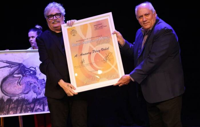 Amaury Pérez Vidal recibió este sábado el Premio Nacional de Música 2025, lauro más significativo otorgado por el Instituto Cubano de la Música del Ministerio de Cultura, entregado oficialmente en el Teatro del Museo Nacional de Bellas Artes, con la presencia de Miguel Díaz-Canel Bermúdez, Presidente de la República, entre otras figuras de la cultura, familiares y amigos del prominente artista.