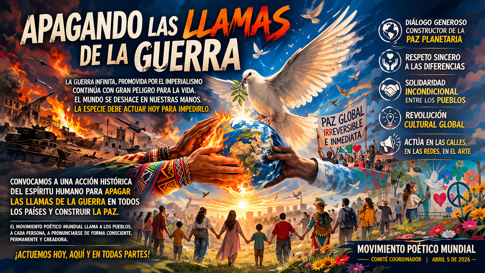 El Movimiento Poético Mundial llama a actuar la los pueblos y a las naciones, a las religiones, a la clase obrera mundial, a los pueblos originarios y a los campesinos, a los estudiantes y profesores, a los luchadores antinucleares y a los constructores de paz, a los pensadores, académicos, defensores del medio ambiente y de los derechos humanos, a los poetas y artistas de la Tierra a crear, a intervenir en los espacios públicos y los auditorios, a publicar en las redes sociales poemas, obras de arte y reflexiones sobre la paz global irreversible e inmediata.