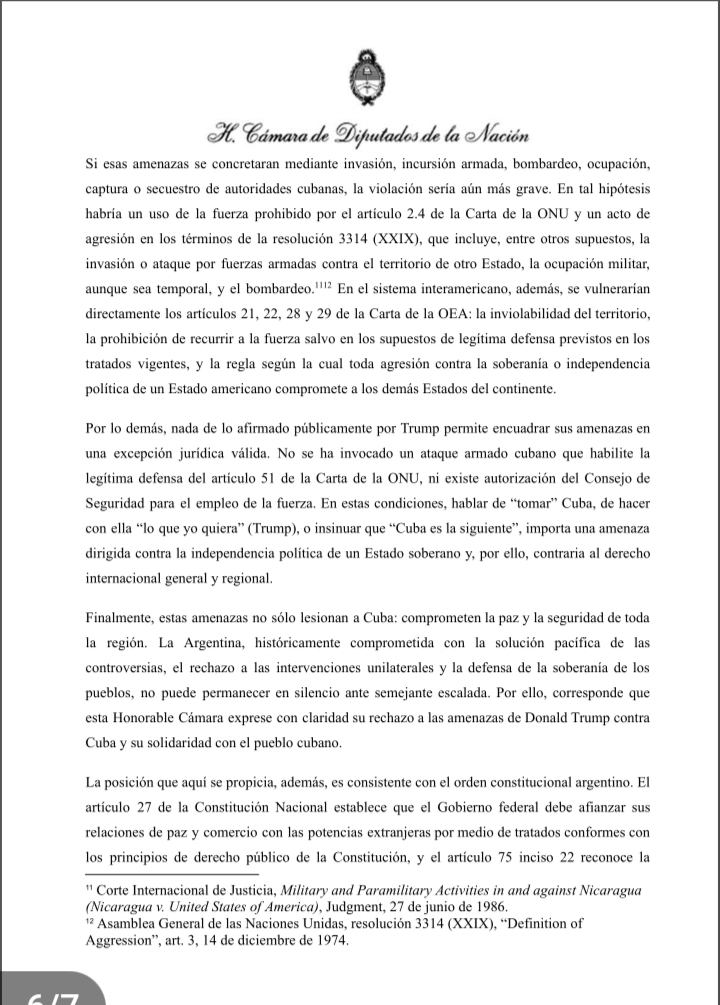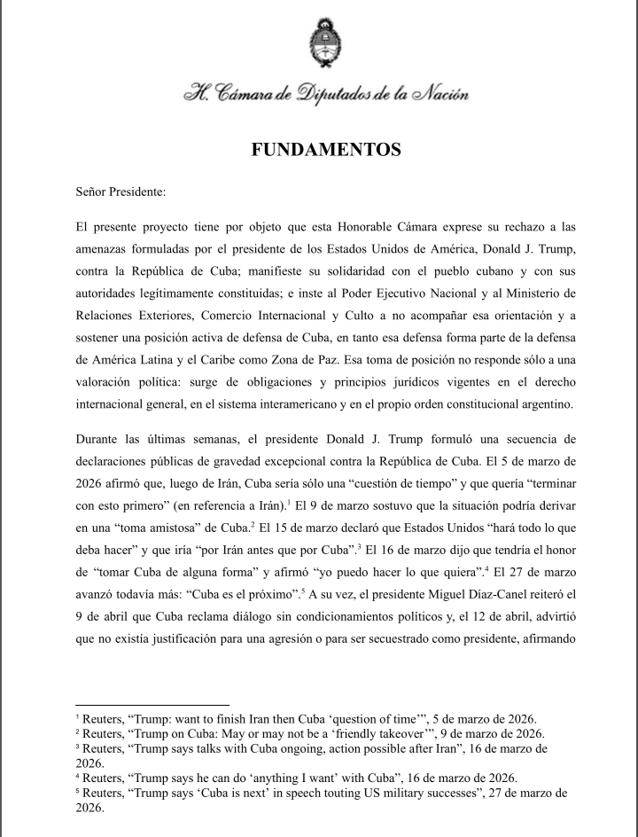 La Cámara de Diputados de Argentina presentó un Proyecto de Resolución en «enérgico rechazo a las amenazas formuladas por el presidente de los Estados Unidos de América, Donald J. Trump, contra la República de Cuba, por constituir una injerencia inadmisible en los asuntos de un Estado soberano»,