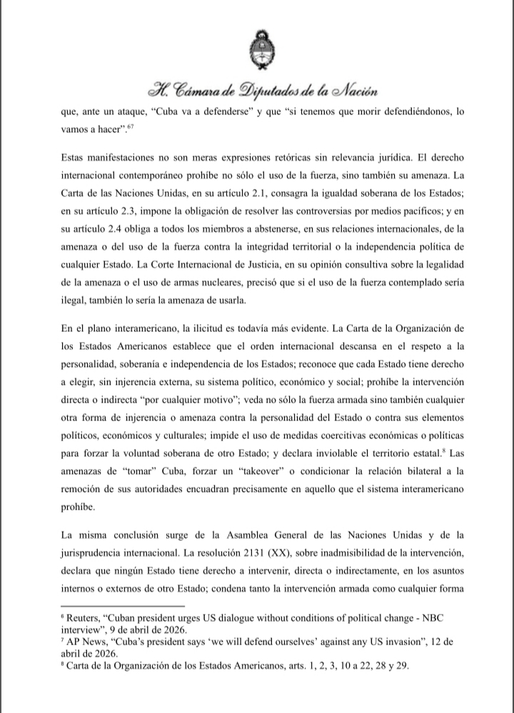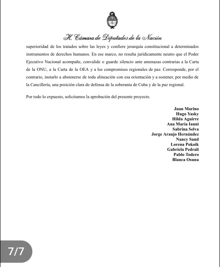 Así mismo, la declaración insta » al Poder Ejecutivo Nacional a abstenerse de acompañar, respaldar, convalidar o facilitar, por acción u omisión, la orientación del gobierno de los Estados Unidos de América encabezado por Donald J. Trump respecto de Cuba, en cuanto ella importe amenazas, injerencias o formas de coerción contrarias al derecho internacional, a la Carta de las Naciones Unidas, a la Carta de la Organización de los Estados Americanos y a los compromisos regionales asumidos por los Estados de América Latina y el Caribe.