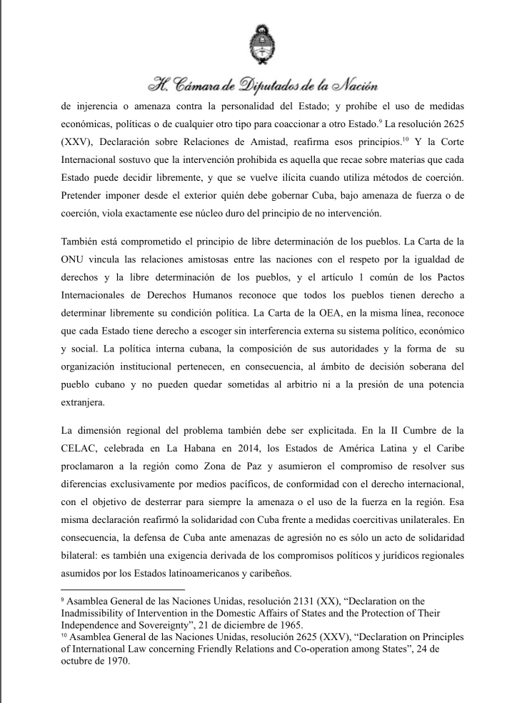 Mediante la declaración, la Cámara de Diputados de Argentina exhorta al Ministerio de Relaciones Exteriores, Comercio Internacional y Culto a: «sostener, en todos los ámbitos bilaterales, regionales e internacionales pertinentes, una posición de defensa de la soberanía, la integridad territorial y la independencia política de la República de Cuba, así como del principio de no intervención».